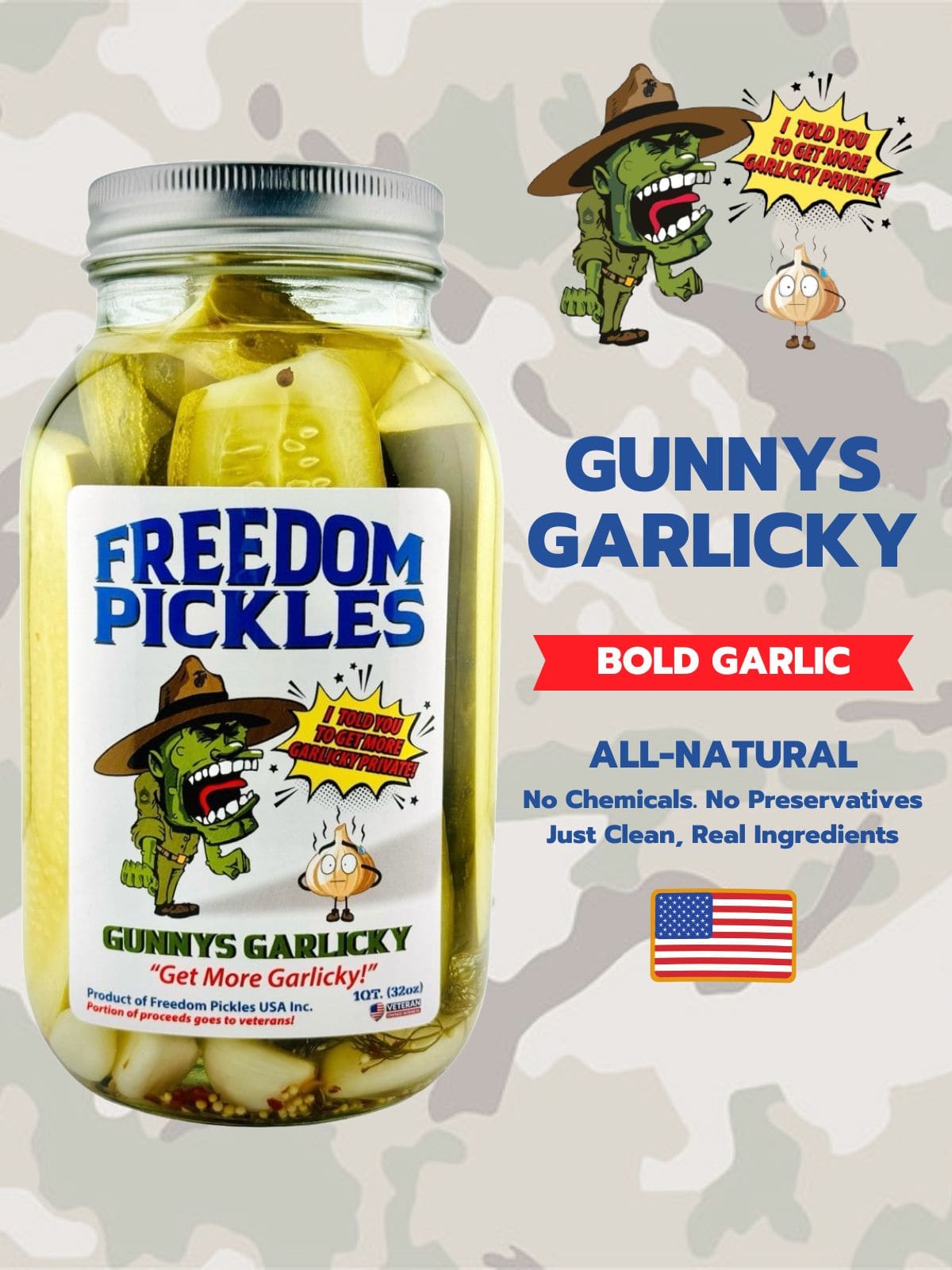 Gunny’s Garlicky Pickles are the ultimate garlic dill pickles for flavor warriors. Packed with bold garlic, fresh dill, and the perfect crunch, each 16oz jar is a tribute to full-throttle flavor and no-nonsense snacking. These aren’t your average store-bought pickles — they’re crafted with all-natural ingredients, hand-selected cucumbers, and a brine recipe so robust, it could pass inspection at boot camp.